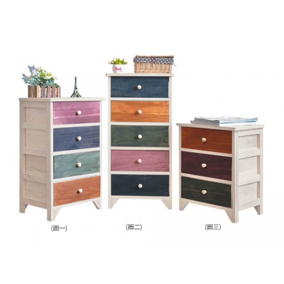 1.32尺北歐鄉村風彩色小四斗櫃(圖一) 型號:HL159-07 尺寸:寛40×深30X高66cm 1.32尺北歐鄉村風彩色小五斗櫃(圖二) 型號:159-08 尺寸:寛40X深30×高80cm